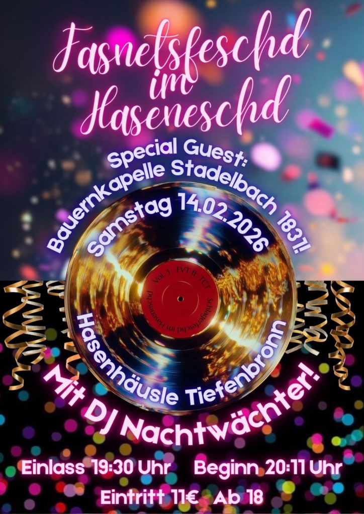 Es ist wieder soweit, am Faschingssamstag, den 14.02.2026 findet unser Fasnetsdeschd im Haseneschd mit der Bauernkapelle Stedelbach 1831 und DJ Nachtwächter im Hasenhäusle Tiefenbronn statt!